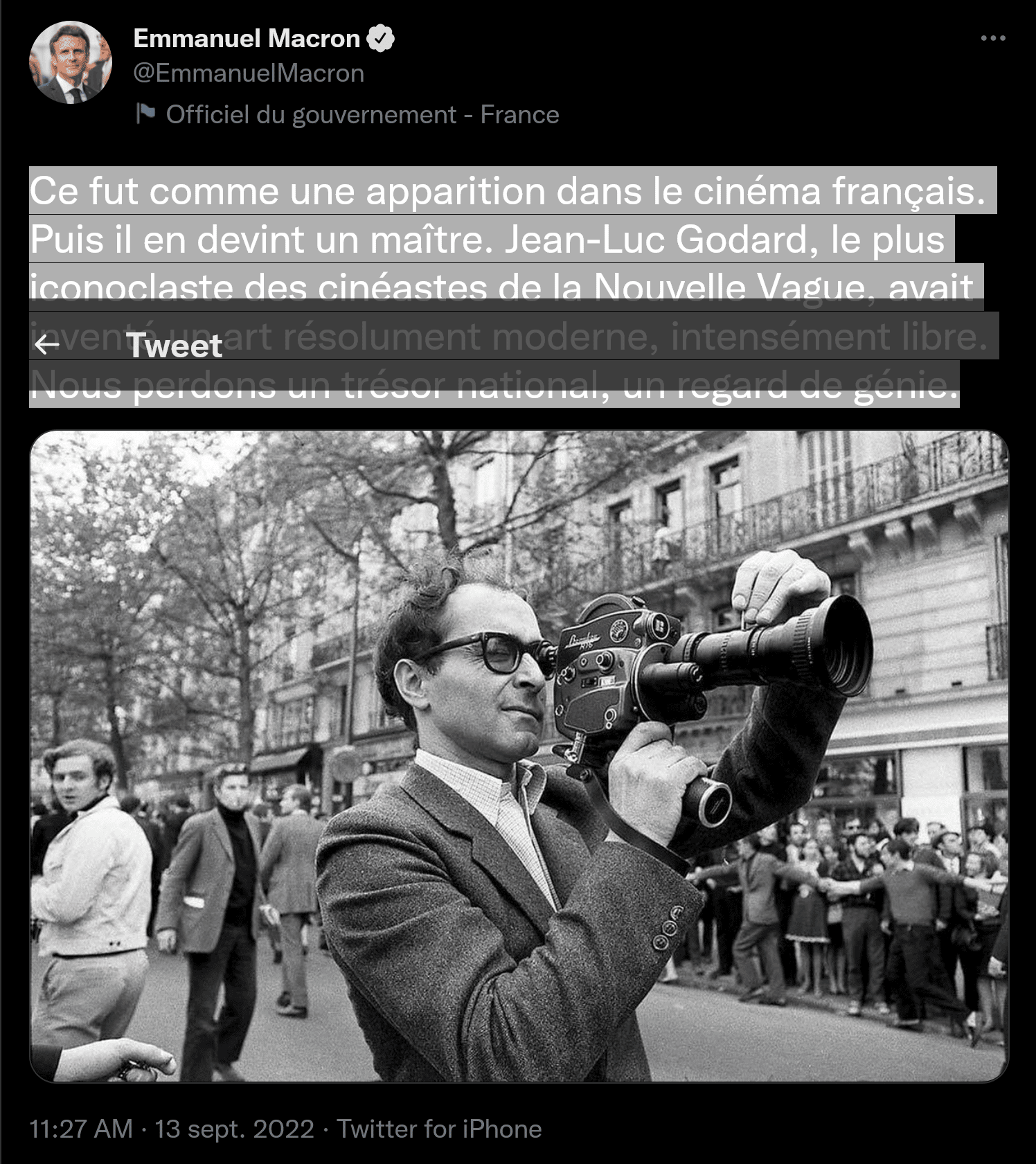 Ce fut comme une apparition dans le cinéma français. Puis il en devint un maître. Jean-Luc Godard, le plus iconoclaste des cinéastes de la Nouvelle Vague, avait inventé un art résolument moderne, intensément libre. Nous perdons un trésor national, un regard de génie.