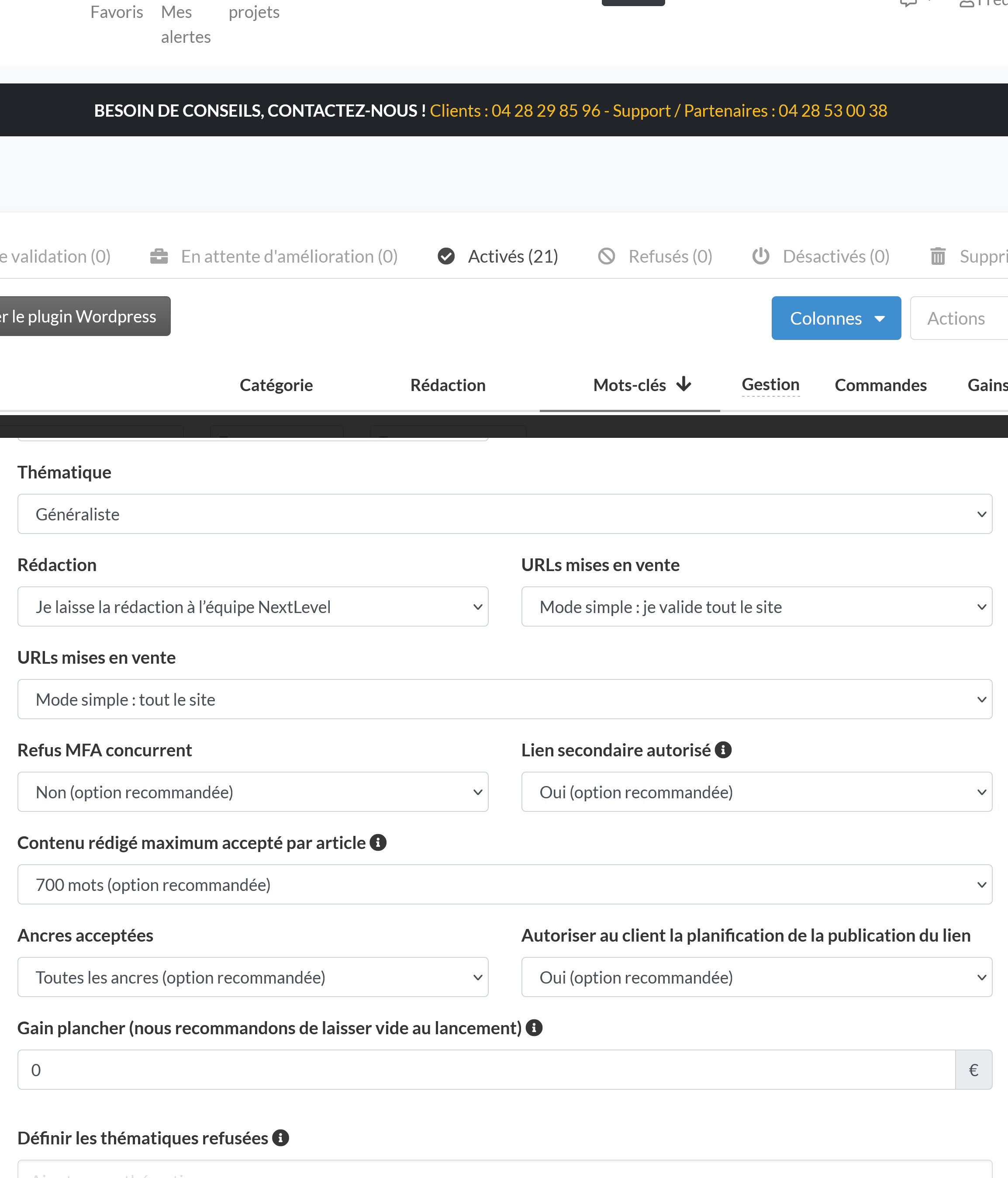 C’est tout récent et c’est une révolution. Qui mieux que Nextlevel connaît les besoins des clients avant tout le monde ? Il vous est proposé gratuitement l’insertion de contenu court (500 mots) répondant aux besoins d’un mot-clé spécifique. Pour cela pour chaque site activez précommande automatique. S’il ne faut pas toucher à l’url, la plateforme de Nextlevel vous permet de modifier l’article, de le bonifier.